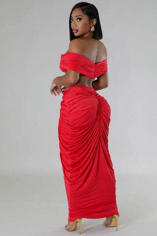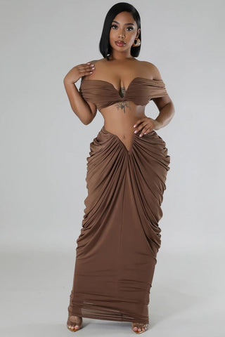Sexy 2pcs set, Crop top v-neckline off shoulder, and Elastic drawstring waist multi-folded long maxi skirt