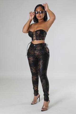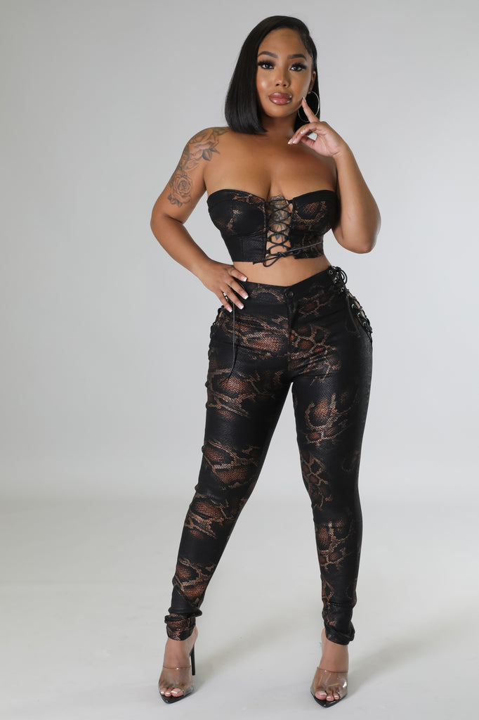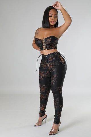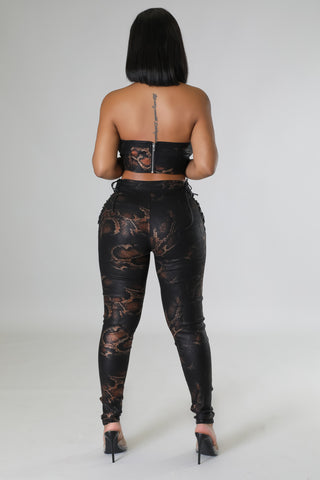 - High waisted pants (Side cutouts, Lace up details, Button zipper closure, Inseam is 29 inches)